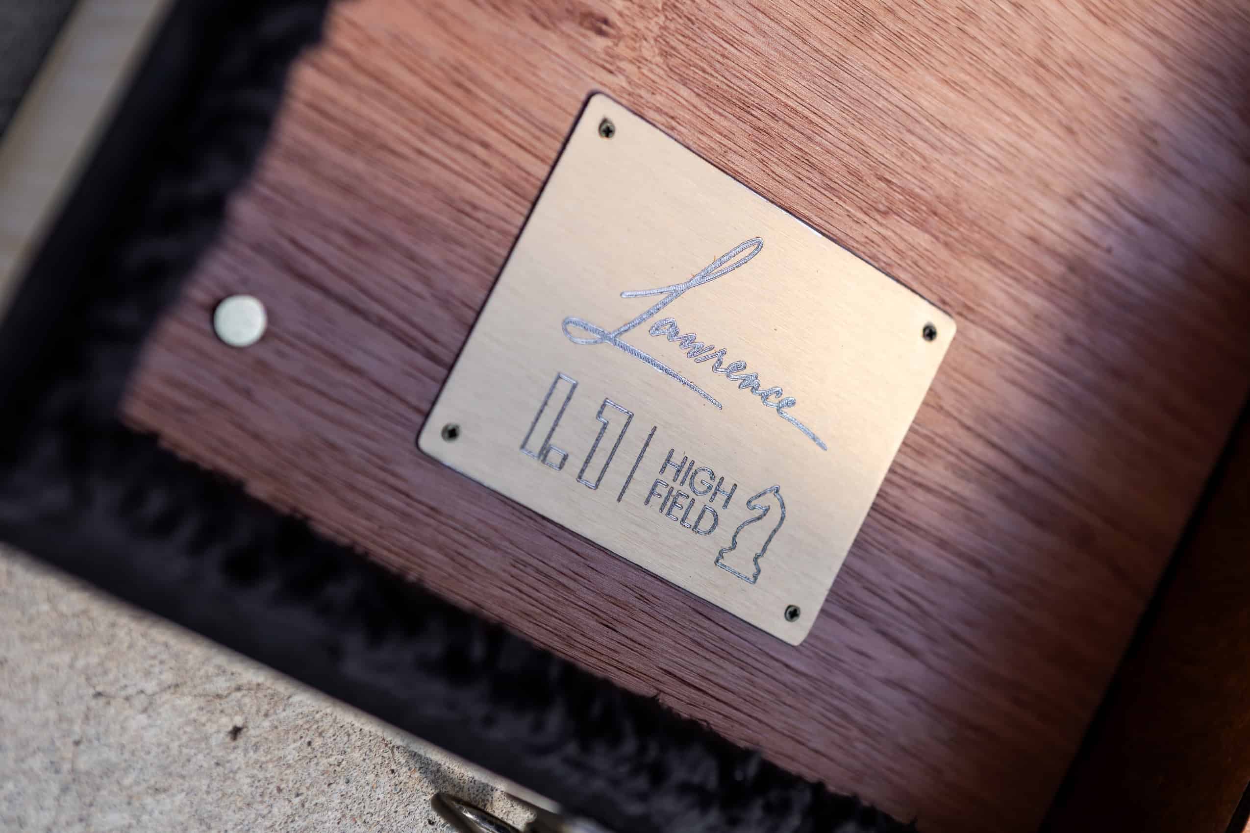 The collaboration extended beyond the guitar itself. The same brushed golden aluminum was used on the custom guitar case, with branded plates on both the exterior and interior. Laser-engraved details — including the L1H White Knight branding, serial number, and Lawrence logos — were refined through careful testing to achieve the perfect depth and sheen, creating a cohesive identity from instrument to case.