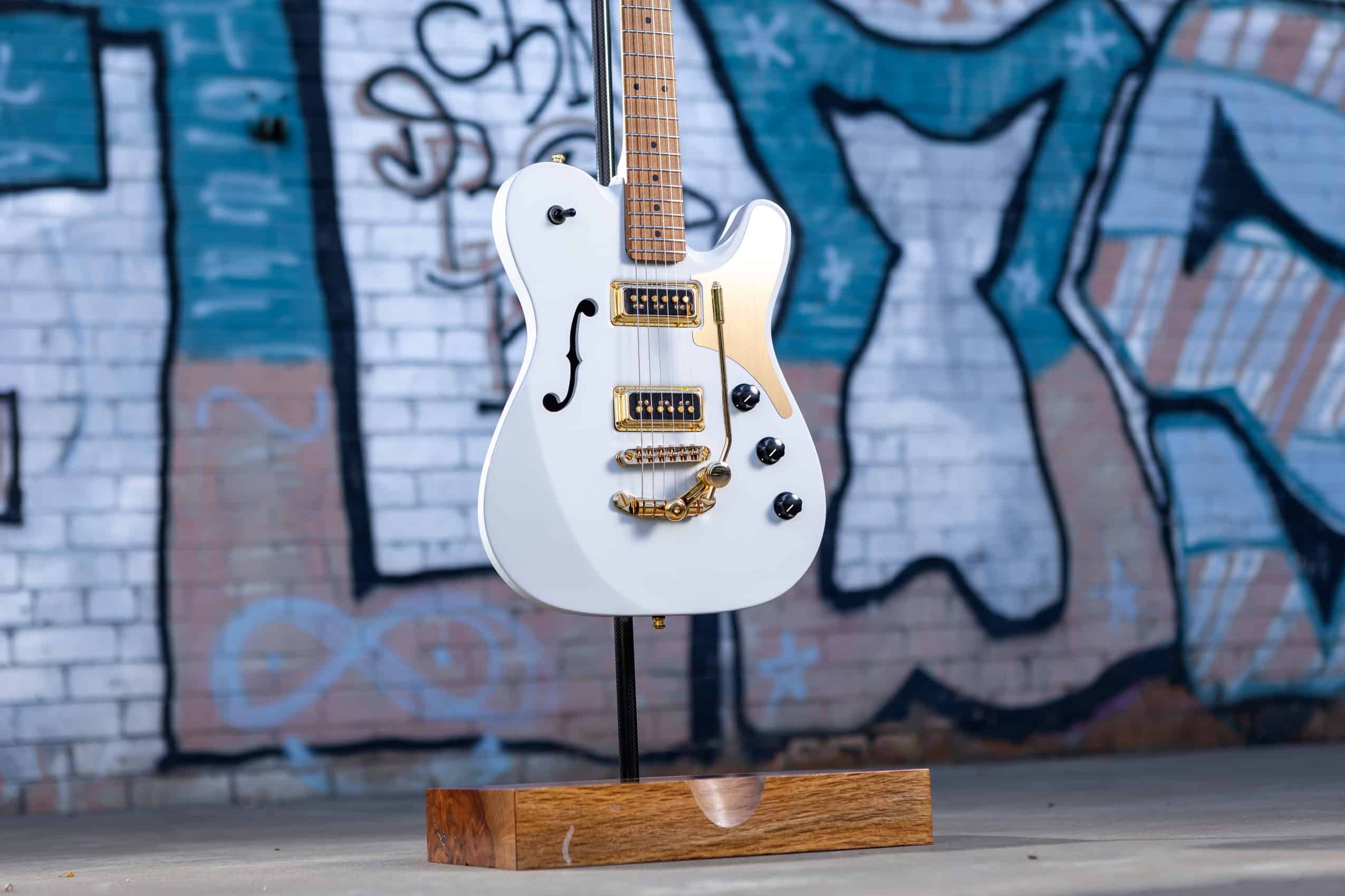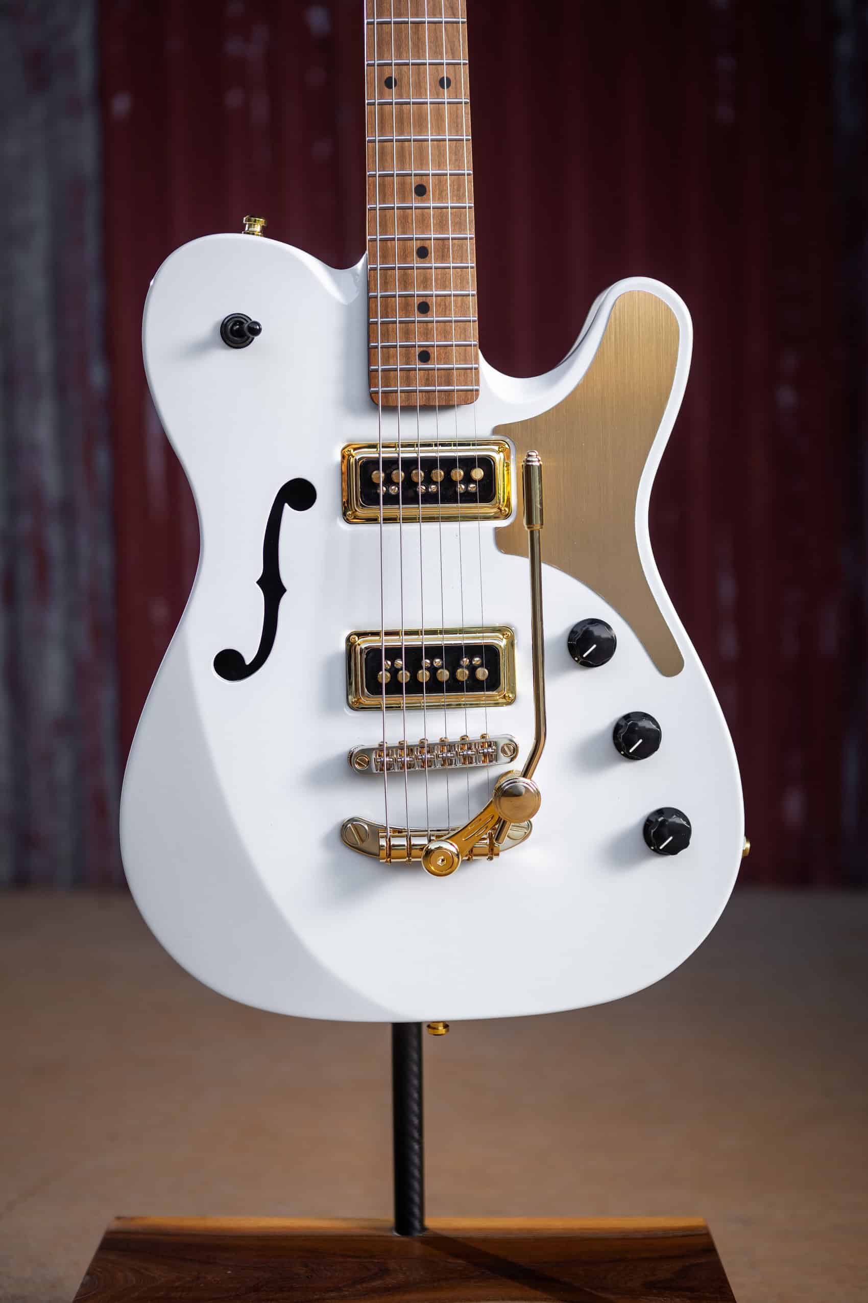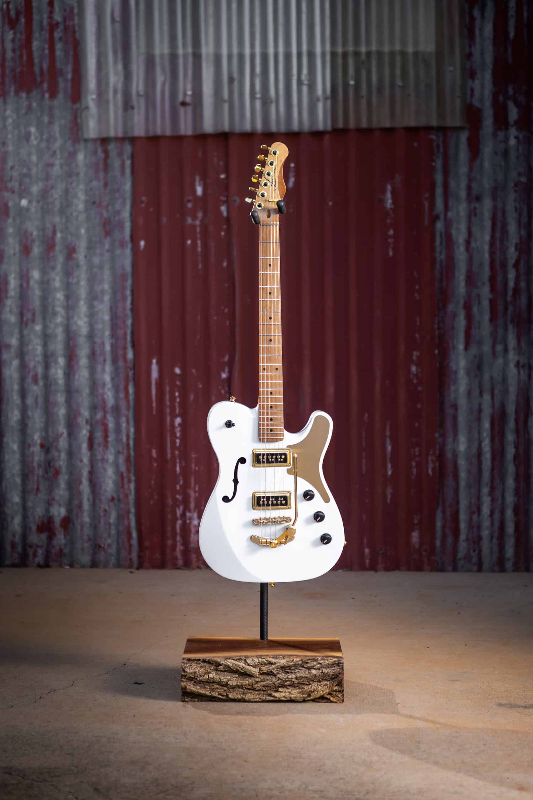 Set against the White Knight’s body, the brushed golden aluminium finish brings warmth, contrast, and depth. The colour and finely defined brushed texture catch the light beautifully, adding a subtle glow that elevates the entire instrument without distracting from its craftsmanship. As Lawrence Guitars described it, the material truly became “the cherry on the guitar design.”